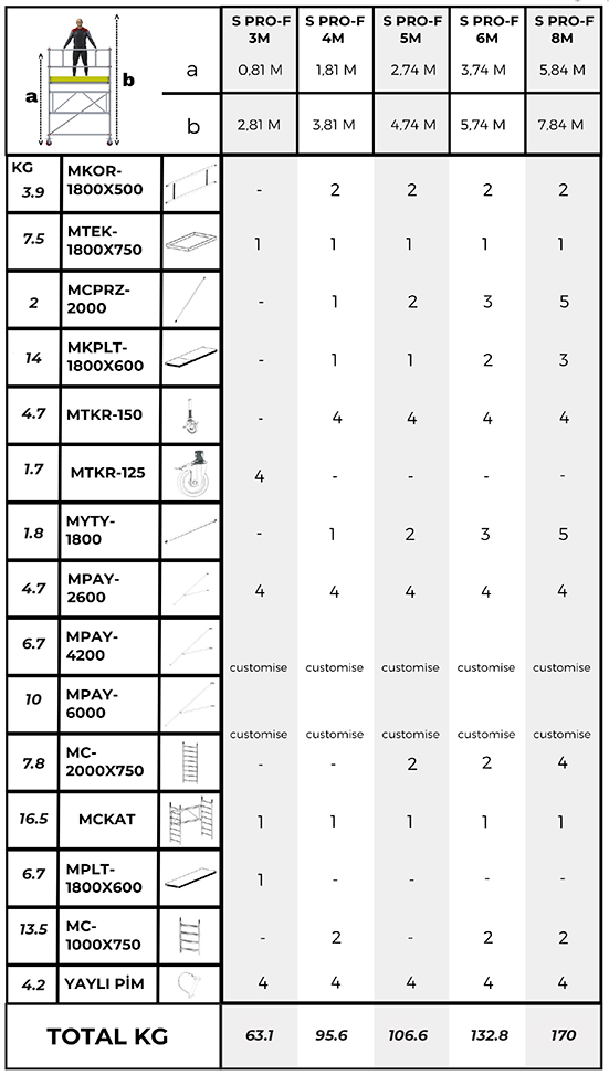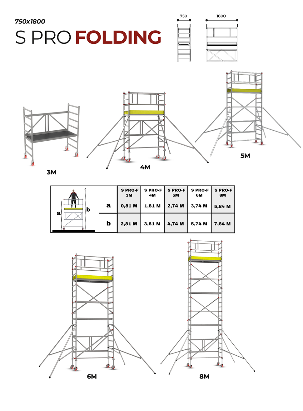 S Pro Folding, 1200x750 mm boyutlarındaki platformu ile çok dar ve kısıtlı çalışma alanları için geliştirilmiş ultra kompakt bir mobil iskele sistemidir. 4–8 metre arası çalışma yüksekliği seçenekleri ile bakım, elektrik, mekanik montaj gibi uygulamalarda yüksek fonksiyonellik sunar. Küçük boyutuna rağmen tam güvenlik sağlayan TÜV ve TSE sertifikalı yapısıyla profesyonel kullanım için uygundur.