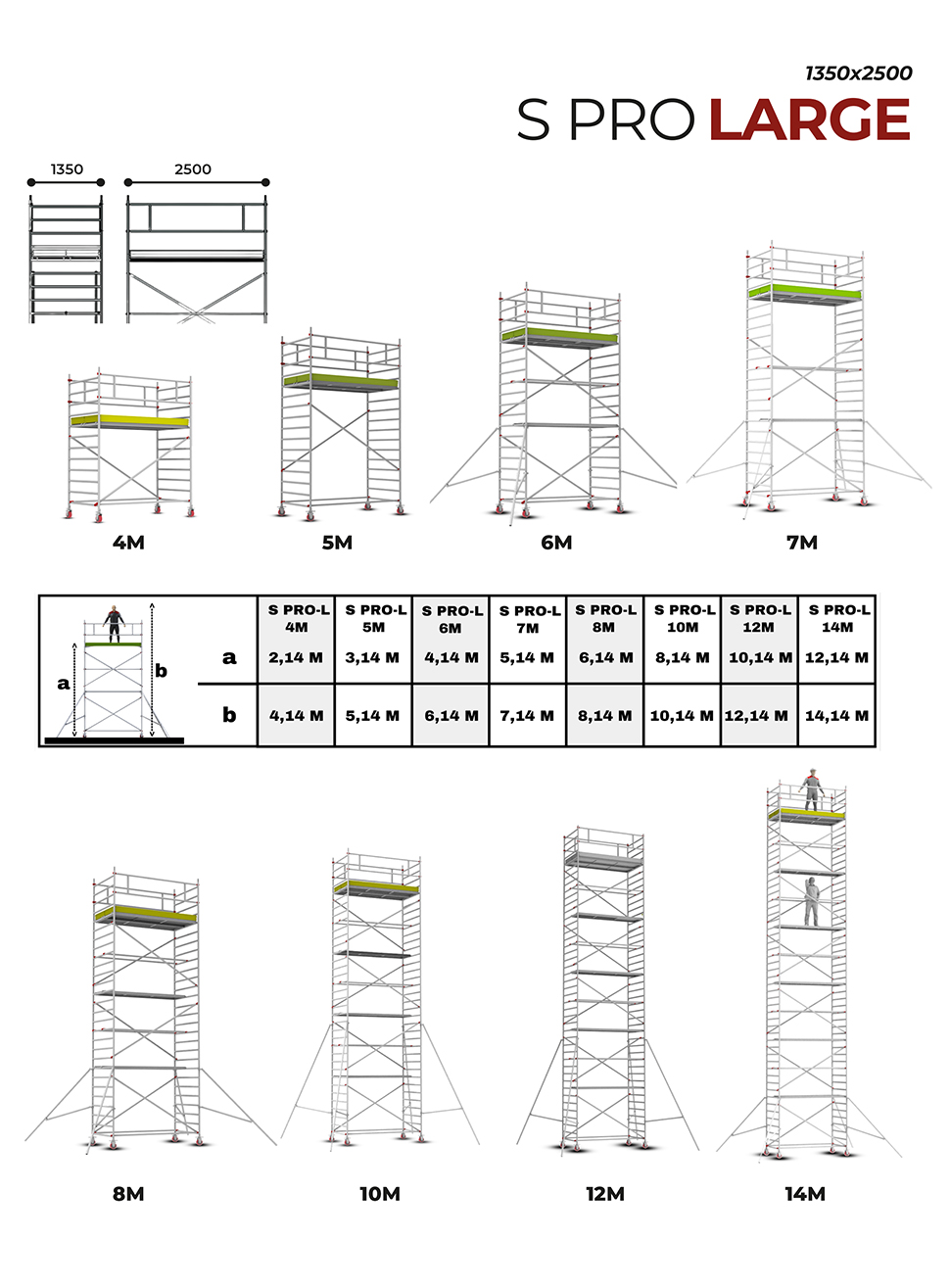 S Pro Large, 4–14 metre arası çalışma yüksekliği sunan güvenli ve modüler alüminyum mobil iskele sistemidir.