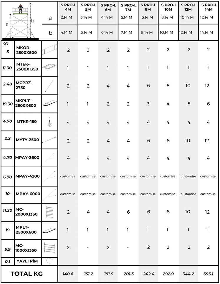 S Pro Large, geniş yüzeyli platform yapısı (2500x1350 mm) ve yüksek dayanımlı alüminyum çerçevesi ile büyük ölçekli projelerde maksimum erişim sağlar. 4 metreden 14 metreye kadar uzanan çalışma yüksekliği seçenekleri, modüler kurulum yapısı sayesinde farklı uygulama ihtiyaçlarına kolayca uyum sağlar. Tekerlekli ve payandalı yapısı, hem iç hem dış mekân çalışmalarında güvenli hareket kabiliyeti sunar. TSE ve TÜV belgeli sistem, güvenlik standartlarını en üst seviyede karşılar.