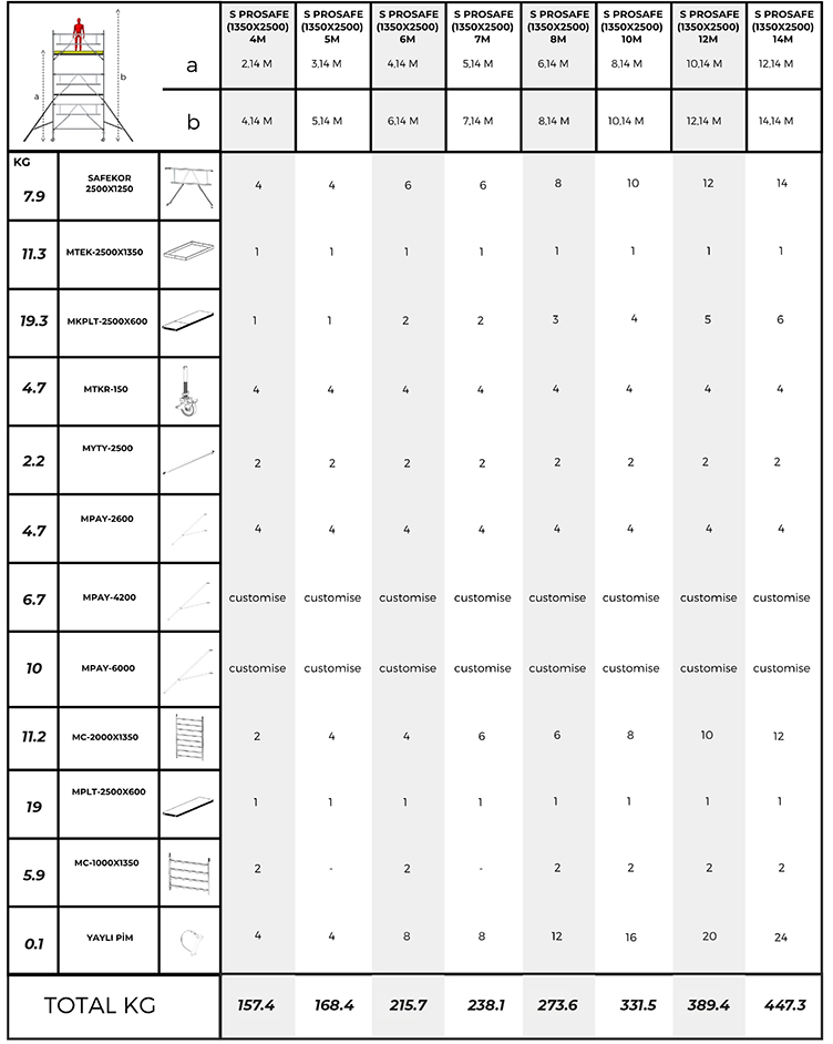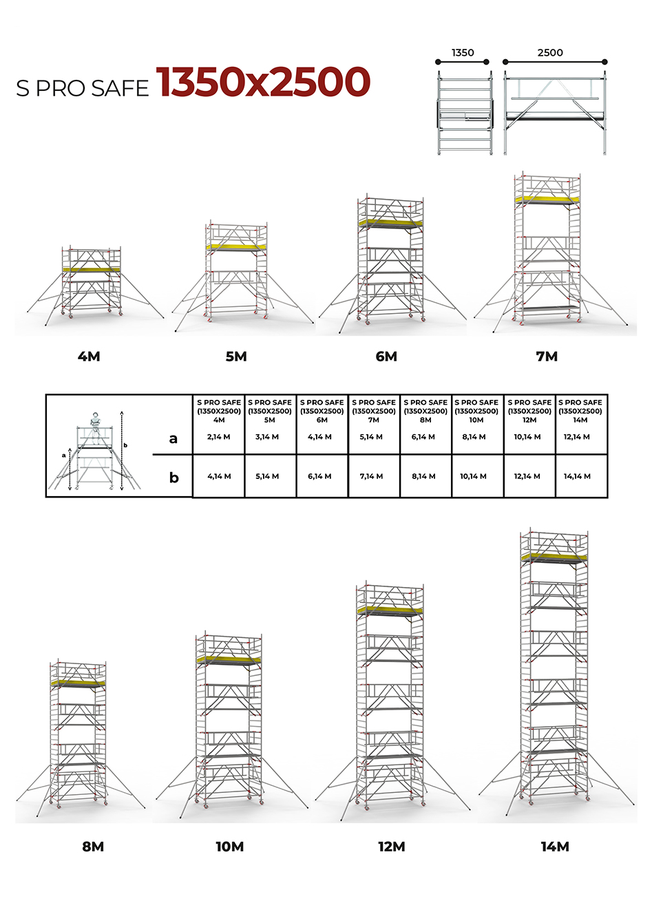 S PRO SAFE 1350x2500, geniş hacimli çalışma sahaları ve kalabalık ekiplerle yapılan işlerde maksimum verimlilik için tasarlanmıştır. Geniş platform yüzeyi, çoklu ekipman kullanımını ve eş zamanlı çalışma imkânı sağlar. Güçlendirilmiş çerçeve yapısı, ağır hizmet koşullarına uygun dayanıklılık sunar. Yüksek irtifa çalışmalarında stabiliteyi artırmak için özel denge ayaklarına sahiptir. Sertifikalı güvenlik standartlarıyla tam koruma sağlar ve montajı hızlıdır.