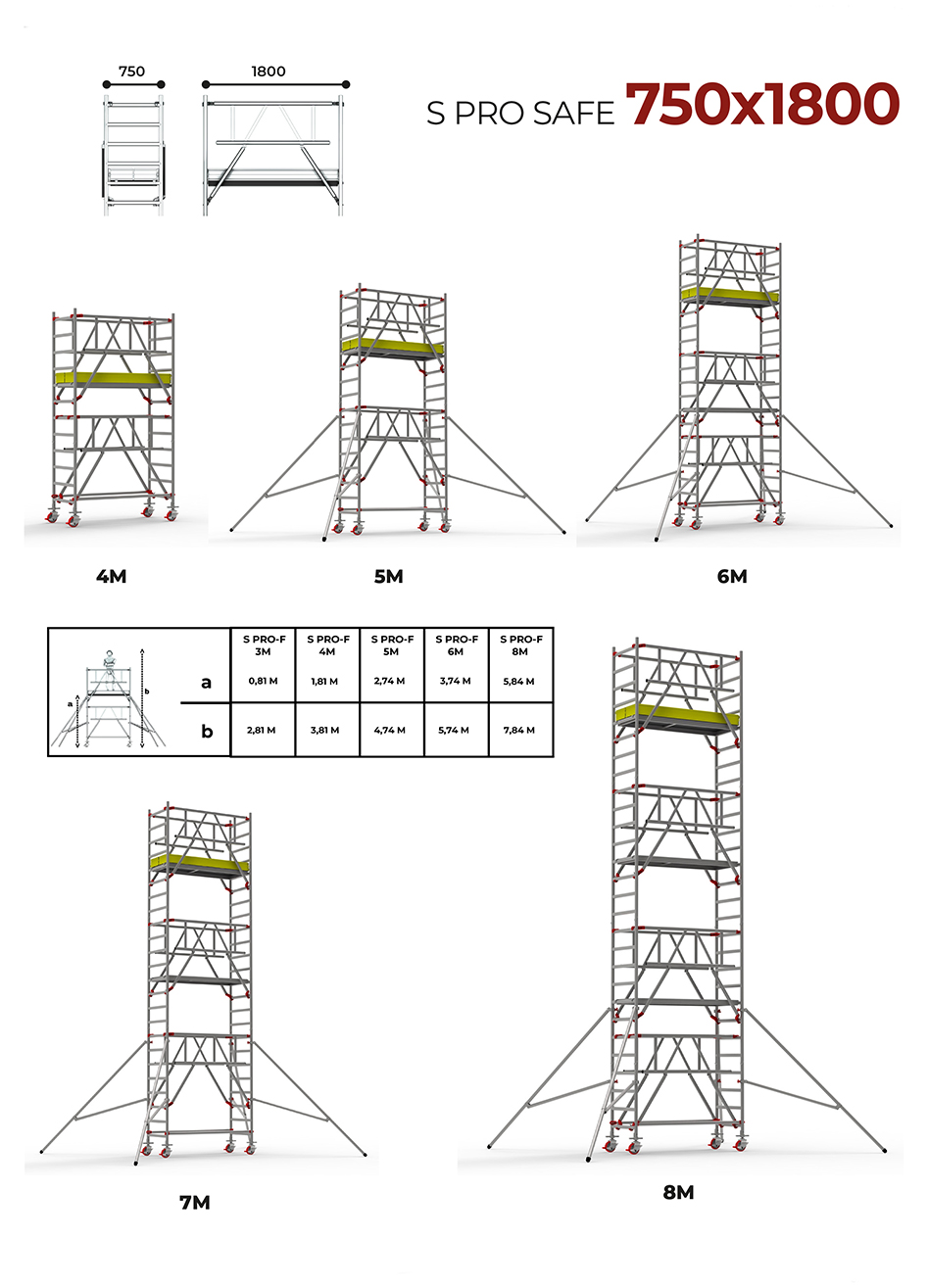 S PRO SAFE 750x1850, sınırlı alanlarda çalışan ekipler için özel olarak tasarlanmış güvenli bir mobil iskele çözümüdür. Hafif alüminyum yapısı sayesinde kolay taşınabilir, yüksek dayanımlı çerçeve sistemiyle titreşimleri minimuma indirir. TSE ve TÜV Austria sertifikalarıyla güvenlik standartlarını karşılar, yüksek çalışma seviyelerine güvenli erişim sunar. Montaj ve demontajı hızlıdır, bakım gerektirmez ve uzun ömürlü kullanım sağlar.